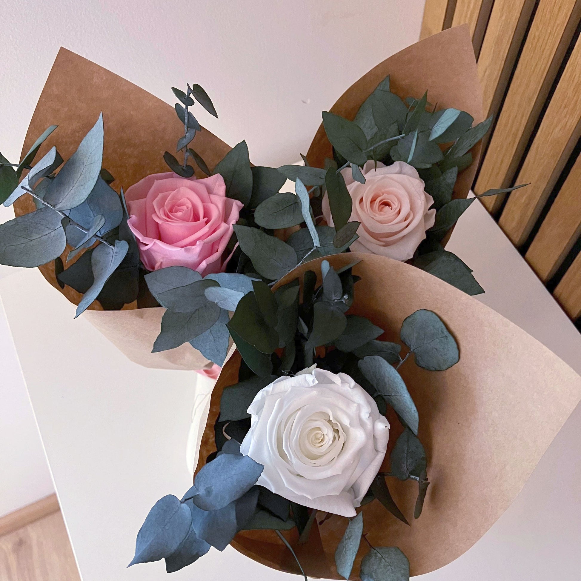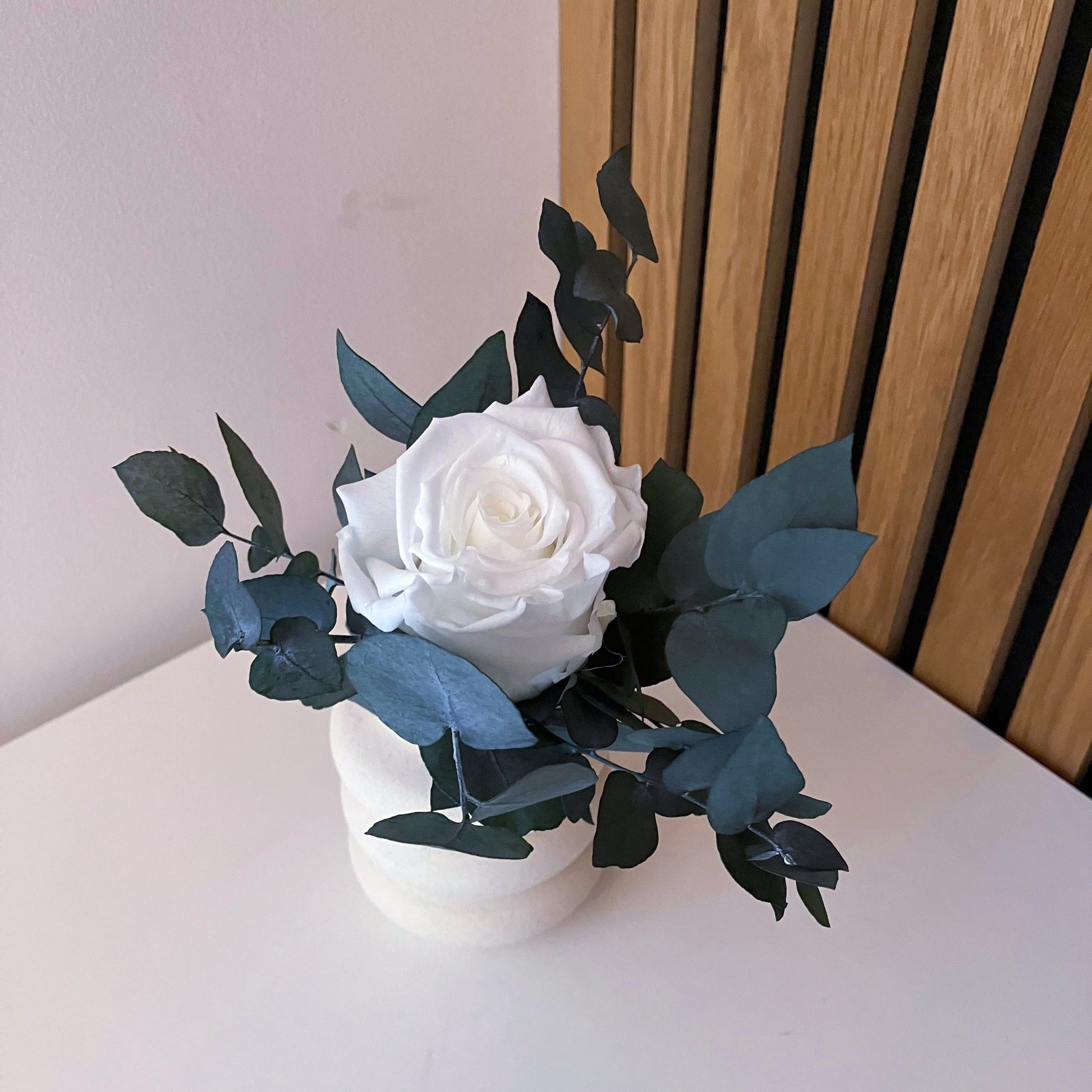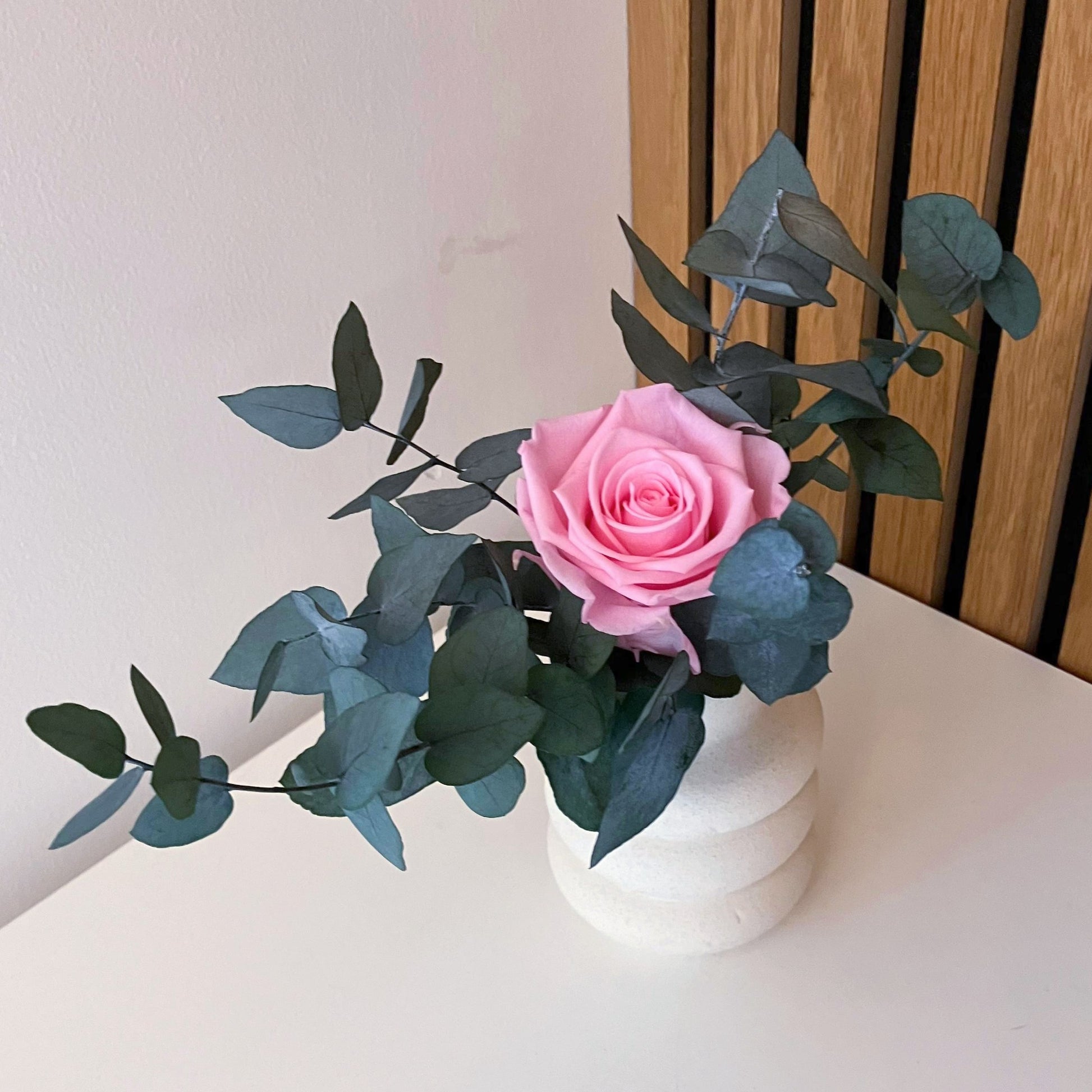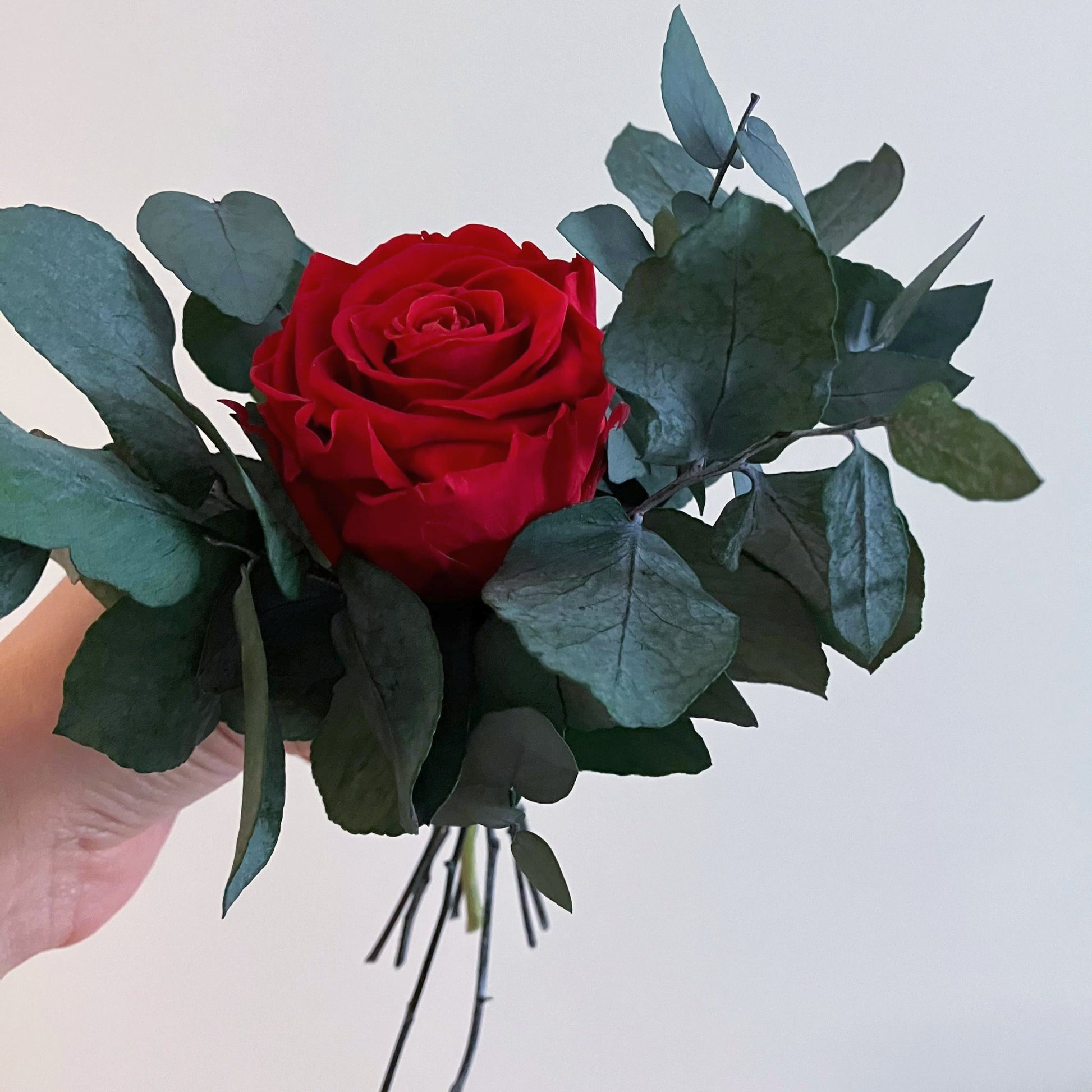Tato minikytice je klasickou kombinací růží a eukalyptu. Je jemnou a přitom nepřehlédnutelnou dekorací každého interiéru. Stabilizované růže v kombinaci s eukalyptem vytvářejí harmonii elegance a přirozenosti. Hodí se do moderního i rustikálního interiéru – jako doplněk do ložnice, na poličku nebo dárek.