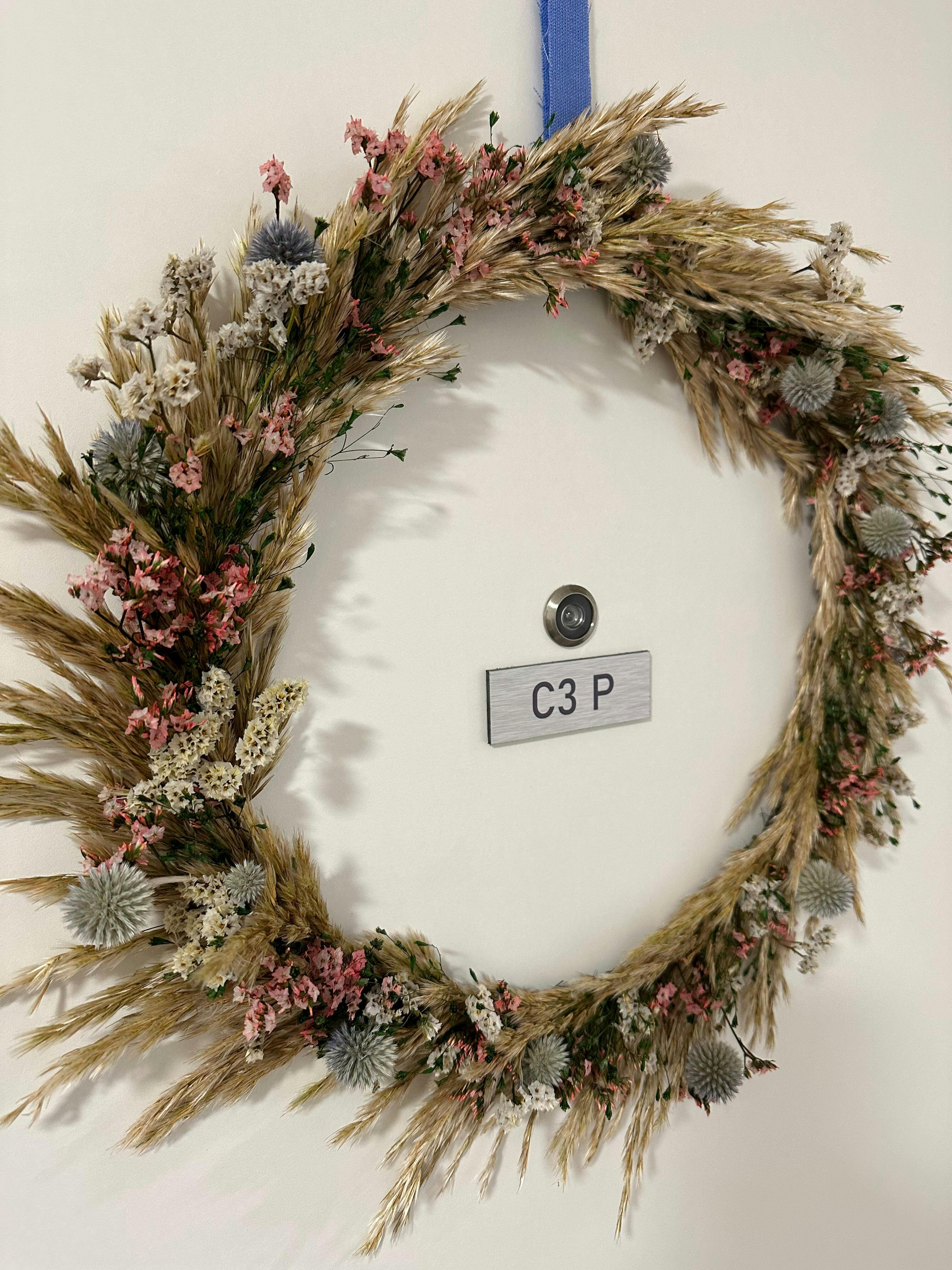 Věnec Polní cesta je ručně tvořený ze stabilizované pampové trávy a dalších květin, doplněný sušeným bělotrnem připomínajícím bodláky. Věnec z kvalitních stabilizovaných květin vydrží krásný po celý rok bez jakékoliv péče.